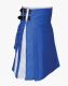 Blue and White Two-Tone Hybrid Kilt with Leather Straps is designed for those modern men who are seeking a kilt to add a contemporary flair to their dressing. It possesses a lautreamont style that makes your look great and attracts the viewer's attention towards your fabulous appearance. It comes with handmade features and is available in various colour combinations to make your personality more stylish. White loops are sewn on the waist area to hold the belt. Blue and White Hybrid Kilt has a simple and decent plain front apron with white piping on the top front waist for a classy look. In contrast, White pleated designs are stitched on either side to make a distinctive piece of Scottish attire. Pure leather buckle straps are styled on both sides for a little bit of adjustment. Large flap pockets are on the back side for holding and carrying your items safely with the help of snap buttons. All the hardware material used during its fabrication is stainless and rust-free. This kilt is crafted with 100 % pure cotton material, ensurings its durability and longevity. It is accessible in all sizes at a reasonable price. You can wear it at Casual parties, Formal gatherings and Special events. Order Now