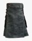 Mens Black Denim Kilt with Large Pockets is designed to meet the everyday needs of modern people who want to express their unique personalities at their upcoming events. It is accessible in various colour options, so you can wear this kilt by making a perfect match with any of your attire. Mens Black Denim Kilt features an attractive design having a simple front apron while flat panels are styled on the back for a modern look. It has snap closures on the front waistline that offer a better and more secure fit for the whole day's wear. It has a leather strap on both sides by which a D-ring and lobster clasp are connected for hanging keys and chains. It has flap pockets that are styled on either side of a kilt providing enough storage for your everyday essentials like a Cell phone, Wallet, and Keys. Black Denim Utility Kilt is manufactured with high-quality Denim. It is handmade and we always deliver new products according to customer’s needs that’s why we have happy customers all around the world. You can wear this kilt at Casual parties, Wedding ceremonies, and Family gatherings. Order now to purchase this fashionable kilt in your exact size at a reasonable price.
