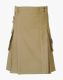 Men's Khaki Utility Kilt is a modern version of the kilt that reflects your style and personality. It is designed for maximum comfort and flexibility and also allows you the freedom of movement. It would be a preferable kilt for the person who wants to look good and do their work activities. Men's Khaki Utility Kilt comes in a traditional pattern with a simple front apron. It has a pleated design on its back, and a buttoned flap is made on it. Snap buttons made on the waistline give you a secure fit. Two buckle straps below the waistline allow for a customized adjustment. Two large cargo pockets on either side of the Classic Kilt make storing your essentials possible. Quality cotton material is used to fabricate this kilt. It is durable, and the hardware material used is rust-free. The Khaki Utility Kilt is suitable for outdoor activities, sports events and outings with friends. Our main goal is to deliver a product that is not only stylish but also ethical. The kilt is available in various colours and sizes to meet your taste. You can purchase it at an affordable price from our collection's unique and fashionable pieces.
