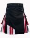 Modern Black Hybrid Kilt in White Red Pleats features striking red and white pleats. It is designed for modern men who appreciate both function and flair. This kilt blends heritage with a powerful American-inspired look. The pleats look like the stripes of the U.S. flag, while red and white straps across the front panel add a unique and eye-catching detail.
