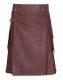 Modern Cargo Brown Leather Kilt is a fashionable garment with style and functional features. Its unique design gives kilt wearers a charming look and a modern touch. This kilt looks more eye-catching and unique due to its brown colour and hardware styling. Men's Brown Leather Kilt is styled with a plain and decent front apron, while pleated designs are stitched on the back and side for easy movement and a traditional look. Snap buttons are used on the top front waist for kilt fastening and to make an accurate fit. Loops are decorated with eyelets and D-rings on the waist area to wear belts and hang lightweight items. Cargo pockets are styled on both sides to carry small items easily with the help of snap buttons. Modern Cargo Brown Leather Kilt is crafted with top-quality pure leather fabric, which is durable and has been used for a long time. Its design and features make the kilt more comfortable for their events. You can purchase it at a low price in various sizes and colours. You can wear it at Traditional festivals, Casual parties, and Wedding events. Order now to express your love of Scottish culture with style.