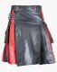 Stylish Black Leather Kilt with Red Pleated Design is a modern and fashionable addition to our kilt collection. It would be a perfect choice for those who want to add a royal twist to their kilt. It is stylish and offers functional elements that will make you different from others in the crowd. We offer this kilt in all colour combinations and sizes, and you can select the one that perfectly matches your personality. Stylish Black Leather Kilt features a simple and decent plain front apron that gives a classy look. In contrast, a Red and black pleated pattern is made around the back, providing ease of mobility during your activities and adding a classic twist to its trendy design. It has Leather buckle straps on either side, providing a comfortable and perfect fit for the wearers. Belt loops are sewn on the waist area to wear a belt and hanging sporrans. Flap pockets on both sides of a kilt offer extra storage for your everyday essentials like a Cell phone, Wallet, and Keys. Stylish Black Leather Kilt with Red Pleated Design is fabricated with pure jeanean Leather fabric that ensures longevity and durability. It is available in various sizes at an affordable price. You can wear it for Casual outings, Scottish and Irish weddings, Formal meetings, and Parties. Order it now.