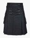 Women's Black Denim Kilt with Detachable Apron is a fashionable garment that offers a trendy look with functional features. It has an attractive front that captures everyone's attention and gives you a stylish appearance. It is available in various denim colours, so you can match your desired outfit perfectly. Women's Black Denim Kilt features a flat detachable apron. It has four button straps on both sides, holding the apron properly. It has snap closures on the waistline area, providing a better and more comfortable fit. A lobster clasp on both sides allows you to decorate the chains or attach lightweight items like keys. It has flap pockets, providing ample storage for your valuable items with easy access. It comes with a pleated pattern on the back, allowing you to move easily and showing your love for the Celtic culture. Women's Black Denim Utility Kilt is crafted with top-quality denim jeans that ensure its durability. It is suitable to wear at Wedding events, Casual outings, and Formal gatherings. It is handmade, and we offer it reasonably priced in your desired size. Order now to make your events remarkable with its unique design.